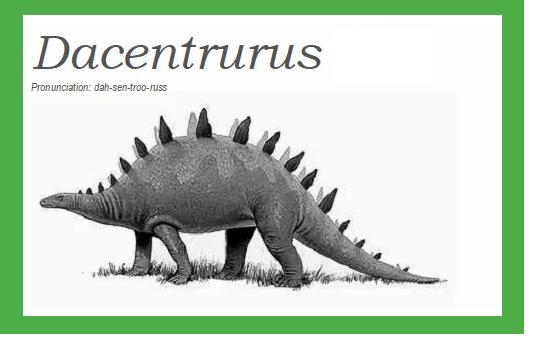 DACENTRURUS (meaning "tail full of points"), originally known as Omosaurus, was a large stegosaur of the late jurassic period (154 - 150 mya) of Europe.